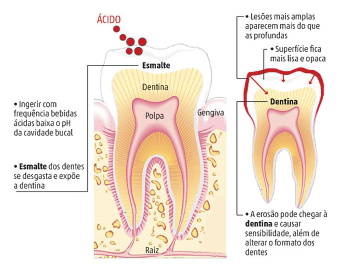 A Erosão Dentária é caracterizada pelo desgaste da superfície dental, provocado pela ação de ácidos de origem não bacteriana (diferente da Cárie Dentária, cuja origem é bacteriana). Sua prevalência tem aumentado nos últimos anos especialmente em grupos etários mais jovens, por conta à mudança de hábitos alimentares, comportamentais, e nas práticas de higiene.